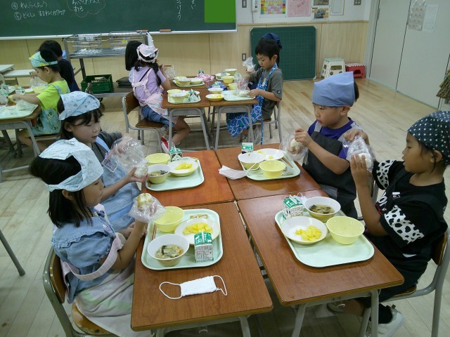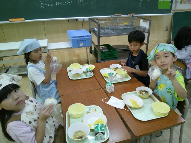 今日の給食は「防災の日」の献立でした。袋にご飯とふりかけを入れて、おにぎりにしていただきました。「先生、どんな形にしてもいい?」と、わくわくしながらおにぎりを握っていた子どもたちでした。