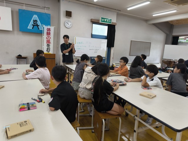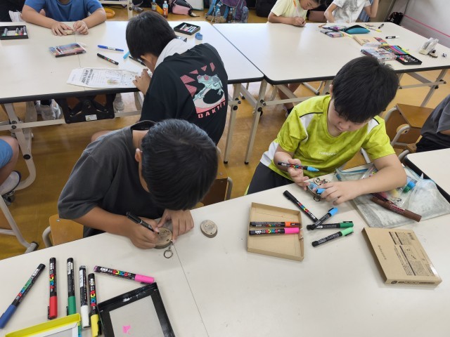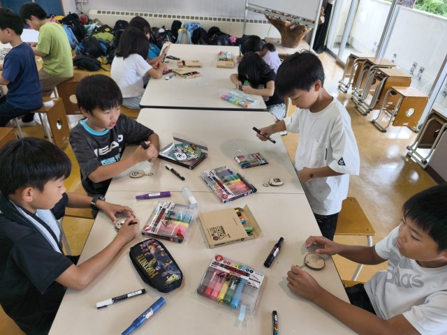 宿泊学習最後の活動は、「キーホルダーづくり」です。職員の方々が、事前に呉羽山の木々を使って準備してくださった輪切りの木に、思い思いに絵付けします。子供たちは、自分の好きなイラストや思い出の絵を描くなど、工夫しながらつくっています。初めての宿泊学習の記念になるといいですね。