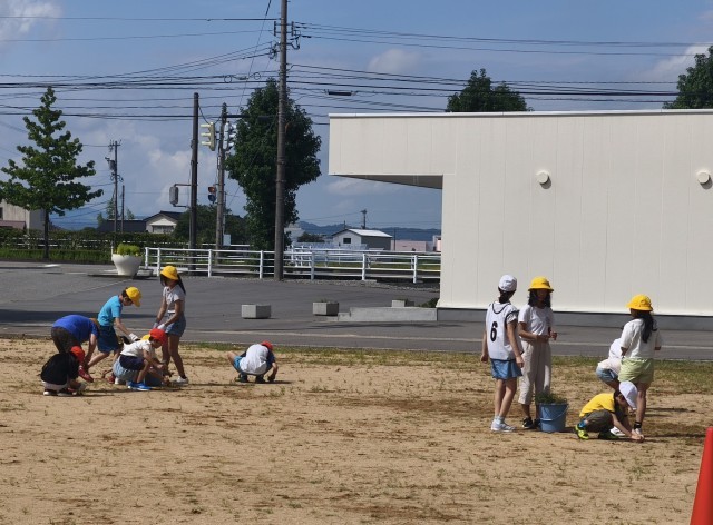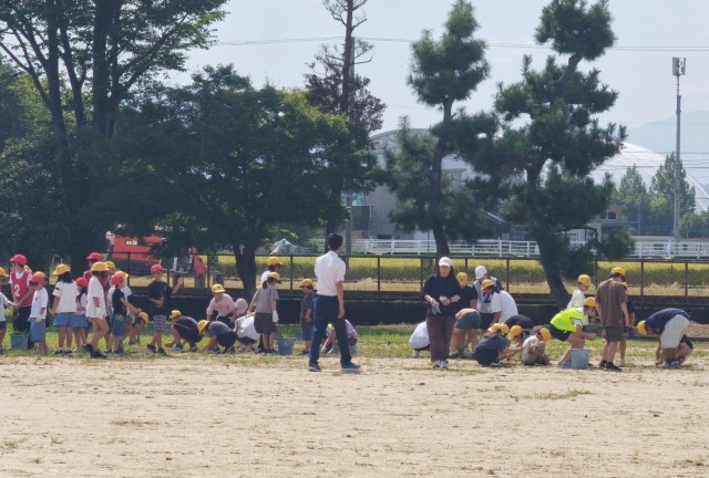 少しずつではありますが、暑さが和らいできました。今日は、すこやかタイムを利用して、運動会の練習のために、縦割り班で草むしりを行いました。「どの団が、たくさんの草を集めるかな?」と、競いながら集中して取り組む新保っ子でした。