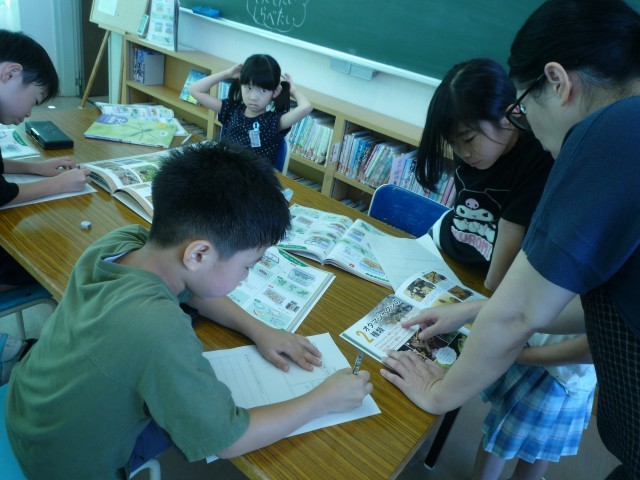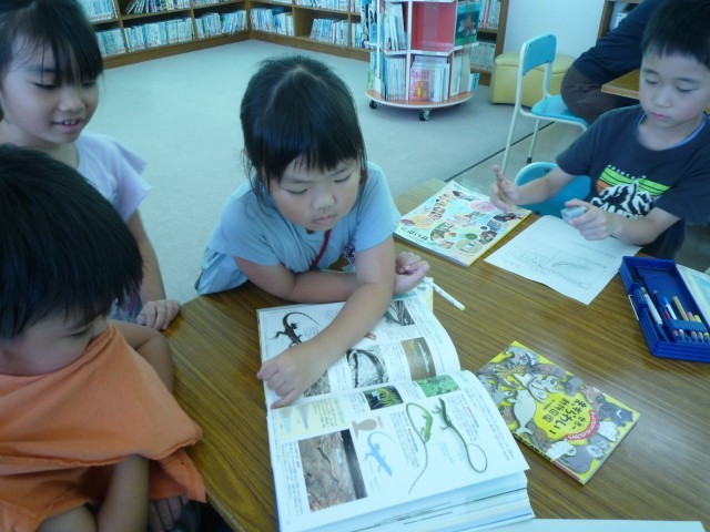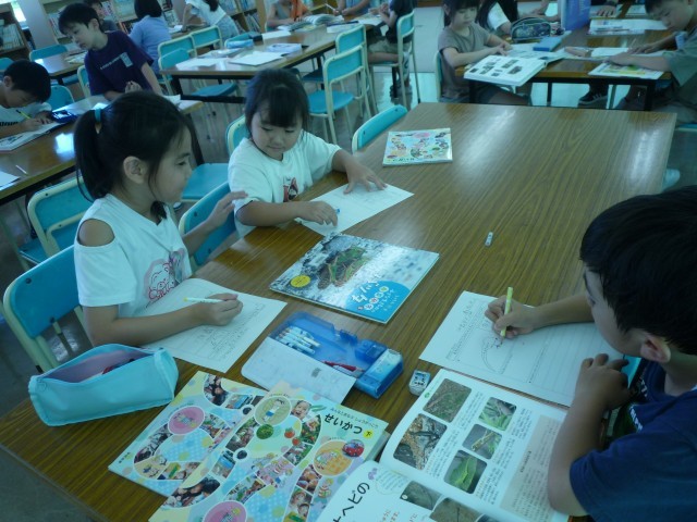 生き物となかよしになるために、図書室に行き、いろいろな生き物について調べました。知らないことを図鑑を使って調べたり、図鑑で調べたことと自分が知っていることを繋げて考えたりして、生き物の住みやすい場所や好きな食べ物(えさ)について詳しくなりました。来週以降、実際に外へ生き物を探しに行きます。また、図鑑を使うときには、司書の先生に使い方を教えていただき正しい使い方を学びました。