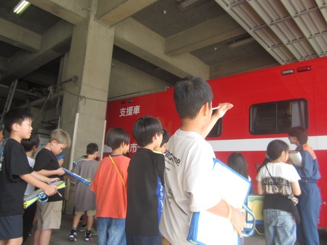 最後に見学したのは、「富山消防署」です。消防車や災害地で活躍する支援車を、間近で見ました。動画を見せてもらいながら、消防署で働く人たちが仕事を分担しながら、働いていることにも気づくことができました。偶然、実際に消防車が出動する瞬間を見て、消防隊の方の素早い動きに驚く子供たちでした。