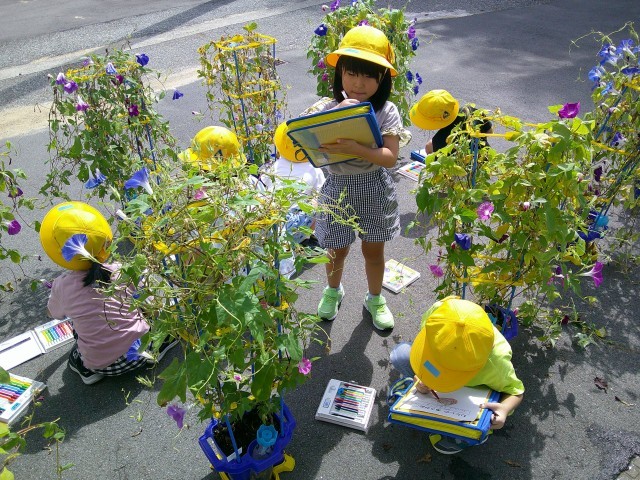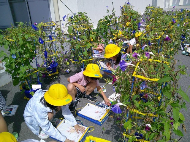 あさがおの種の観察をしました。茶色の実の中には、5月に植えた種と同じものが入っていました。種がたくさんでき、毎日の種とりを楽しみにしている子供たちです。