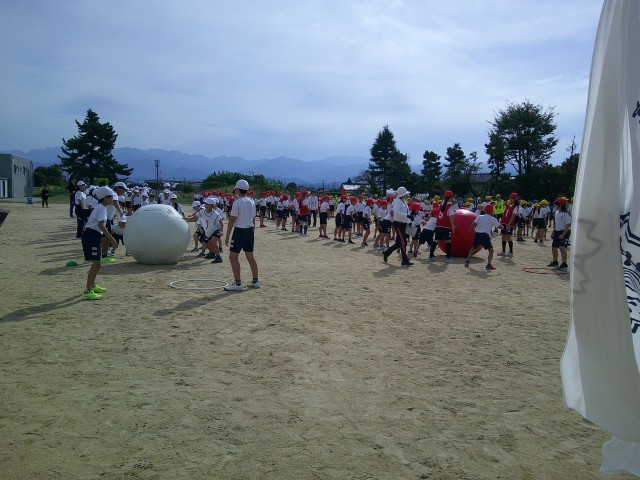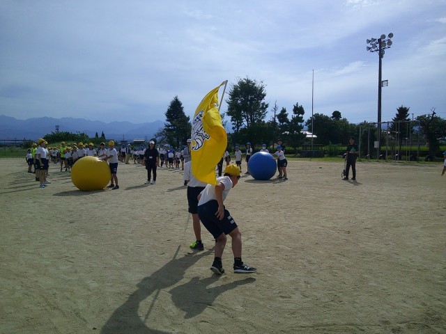 今日は縦割り種目の大玉ころがしの練習をしました。団のみんなで協力して玉を転がします。高学年が優しく声を掛け、素早く並んで練習することができました。