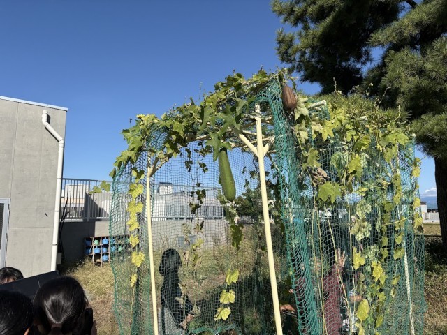 1学期から2学期にかけてヘチマを育てる活動に取り組んできました。季節は秋となり、ヘチマの実も大きく育っており、その大きさに子供たちは驚きながら観察しました。