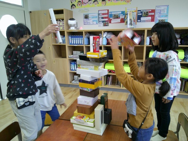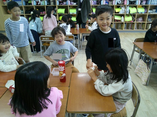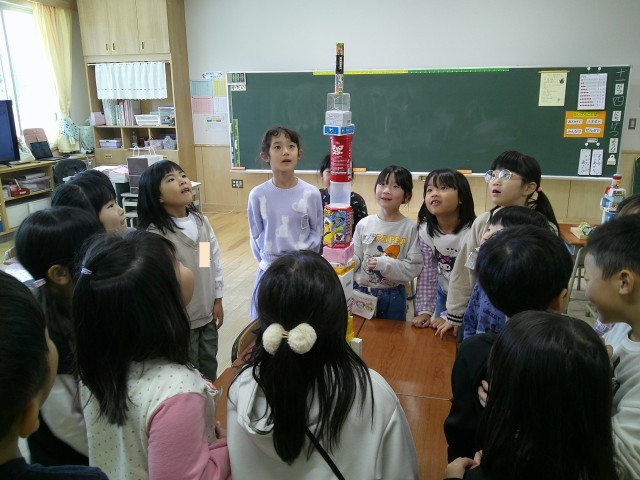1年生:算数科「かたちあそび」:11月5日(水) 公開日 2025/11/05 更新日 2025/11/05 1年生の部屋 算数科では、物の形の特徴について学習しています。「箱の形は平らで重ねやすい」「ボールの形は転がる」など、それぞれの形の特徴をとらえながら、班の友達と一緒にいろいろなものを作ったり、形当てクイズをしたりして理解を深めています。