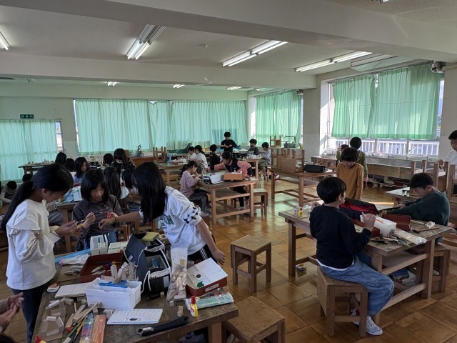 今日は、のこぎりで切った木材をボンドや釘をつかって、つなげて形を作りました。のこぎりや金づちを上手に使いこなして、木材を組み合わせて作りました。
