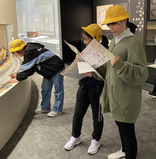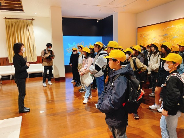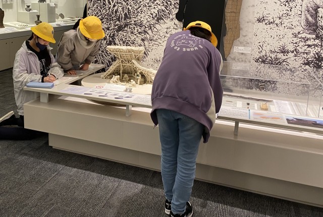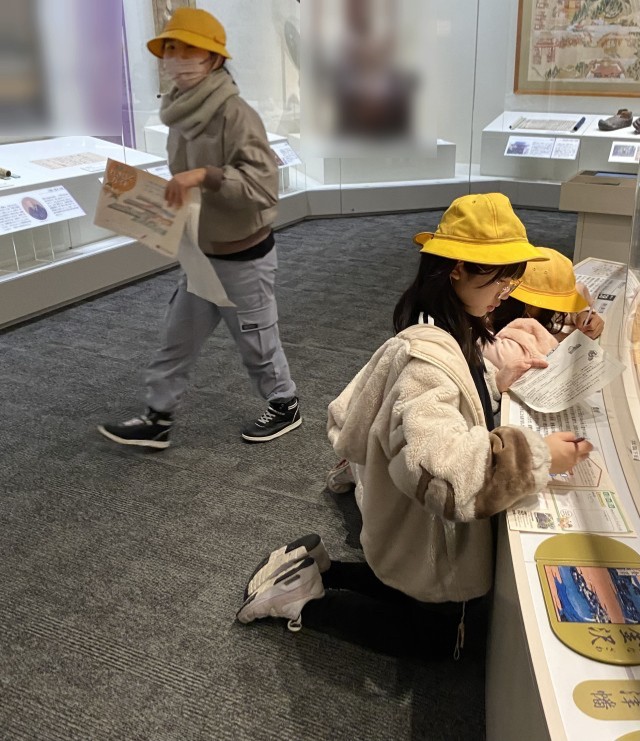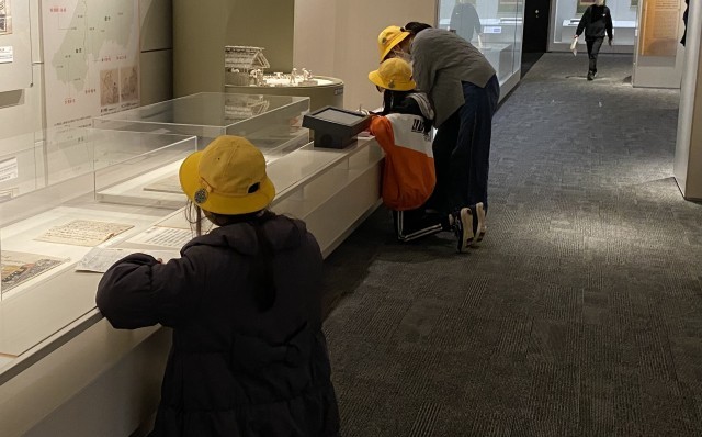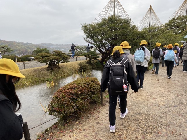 弁当のあとは、兼六園の紅葉や風情ある景色を見ながら、石川県立歴史博物館に行きました。社会で学習した知識と照らし合わせながら、数々の歴史ある展示品や文化財を見ました。特に参勤交代の様子を表したレプリカや説明を見て、「こんなに多くの人が一度に江戸に行くなんて、大変だ」「12泊13日もかかり、宿泊代も高いんだ」と、驚いた様子でした。