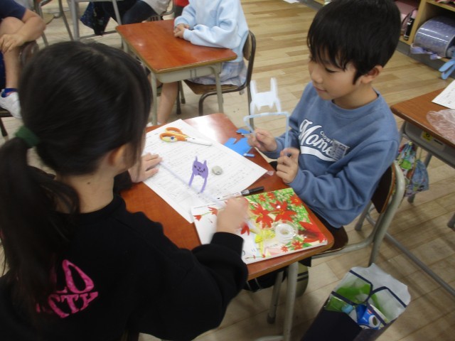 国語科では、「紙コップ花火の作り方」の学習を終えた後、実際に曲がるストローを使って「てつぼうねこ」を作りました。材料や道具、作り方の大事なポイントはどこか、どんな書き方をすれば分かりやすいか、順序を表す言葉や絵を用いて作文を仕上げました。