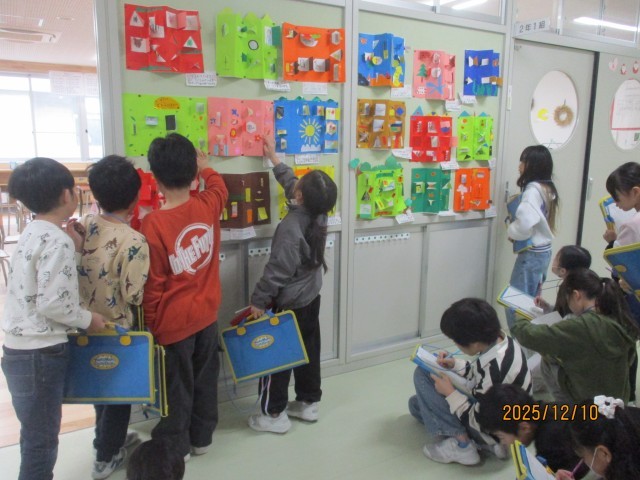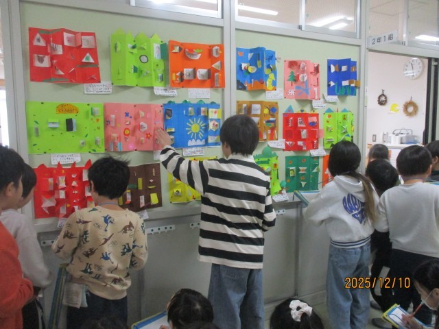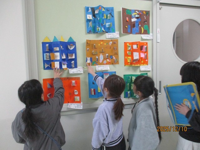 図画工作科では、カッターを使った「まどをひらいて」の作品ができ上がり、友達の作品を鑑賞しました。「まどを開けるのがわくわくする作品があったよ。」「まどやかべの模様、オリジナルなまどが丁寧ですてき」と、一つ一つまどを開けてみながら楽しく作品を鑑賞することができました。