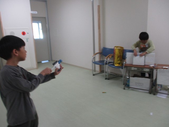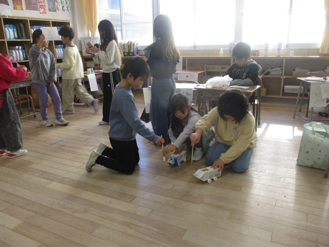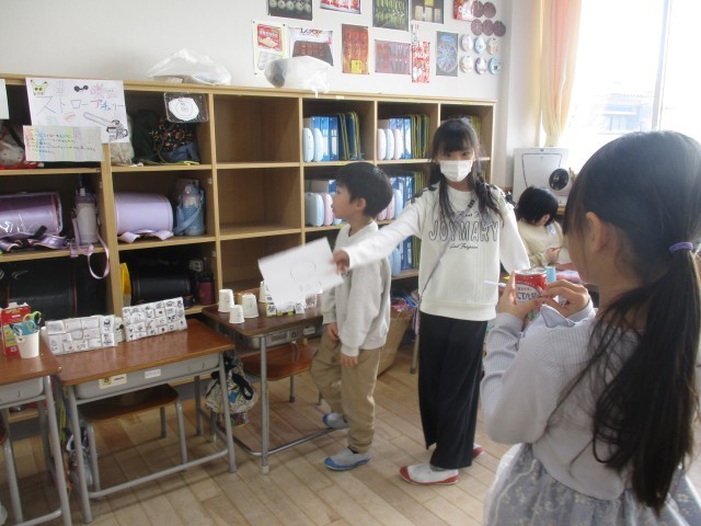 生活科の学習では、ゴムのしかけなどを使った動くおもちゃができ上がり、お試しでお店を開いてみました。遊び方やルールを決めたり、看板を作ったりして、実際にお客さんに遊んでもらいました。スムーズに車が動かない、跳ばない、的に当たらないなど、うまくいかないところも勉強です。お客さんからアドバイスをもらい、また、しっかり見直して、みんなが楽しめるお店を目指します。