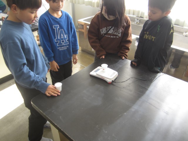 理科では、重さの学習をしています。塩と砂糖を同じ容器に入れ、体積を同じ状態にしたとき、重さはどうなるのか調べました。子供たちは「きっと砂糖の方が重いよ」「体積が同じならきっと同じ重さだよ」と予想を立てながら、楽しんで実験に取り組んでいました。