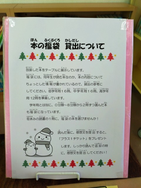 本日より、冬休み前の本の貸出が始まりました。一人3冊借りることができます。また、今年も「本の福袋」(低・中・高学年用の本、0分類~8分類の本)が用意されています。寒い日は、温かいお家の中でじっくり読書するのもいいですね。