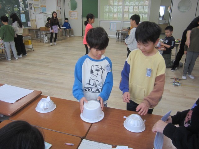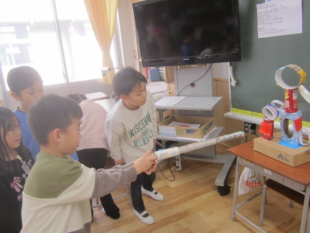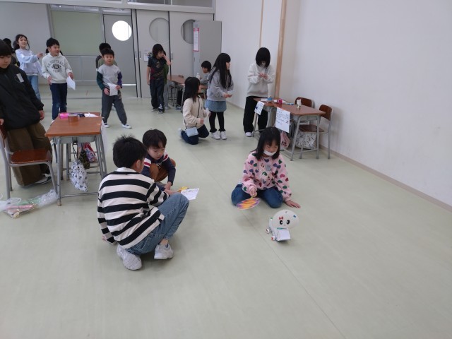 2年生の工夫の凝らしたおもちゃで、1つずつ順番に楽しく遊びました。2年生に優しく遊び方を教えてもらったり、ゲームで高得点を取ったりして、大満足の時間となりました。