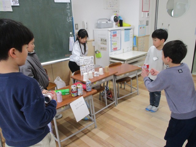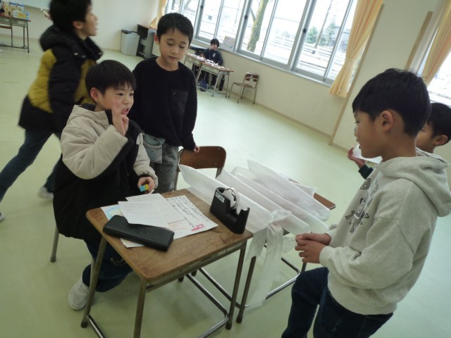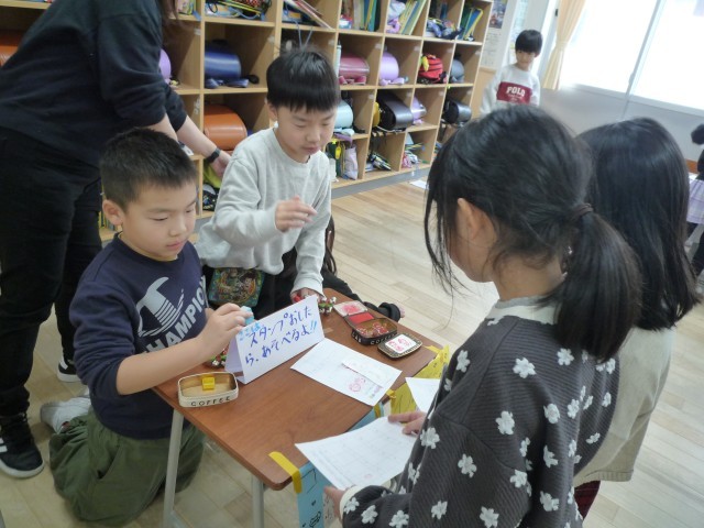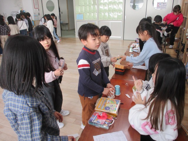 「ハッピーおもちゃランド」開店です。初めは、緊張でおとなしく座っていた子供たちも、どんどん立って「いらっしゃいませ。」「やってみない。」と大きな声で呼びかける声が聞こえてきました。優しく遊び方を教えたり、「すごい。上手。」と盛り上げたりする姿は、さすが先輩。1年生さんに楽しんでもらおうとがんばる素敵な姿がたくさん見られました。