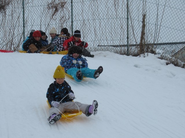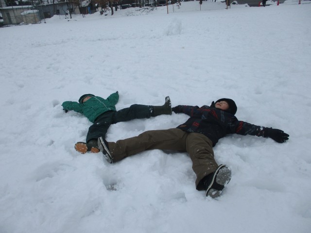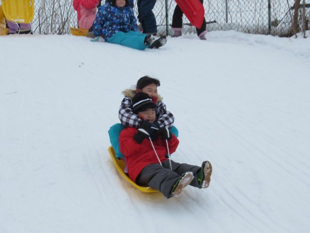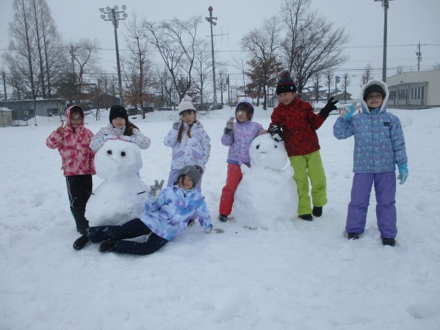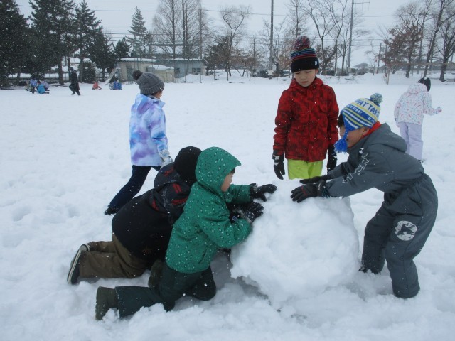 雪がたくさん積もったので、今日の体育では、2年生みんなで雪遊びをしました。朝から雪遊びを楽しみにしていた子供たちは、スキーウェアに着替えて元気いっぱい外に飛び出していきました。そりで滑ったり、雪だるまを作ったりするなど、思い思いの遊びを楽しむことができました。中には、雪の上に寝転がっている子供たちもいました。雪が積もる地域ならではの活動ができ、大満足の子供たちです。