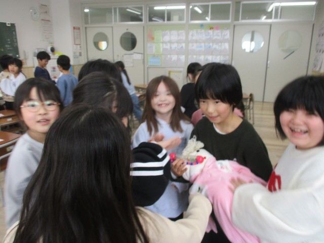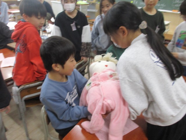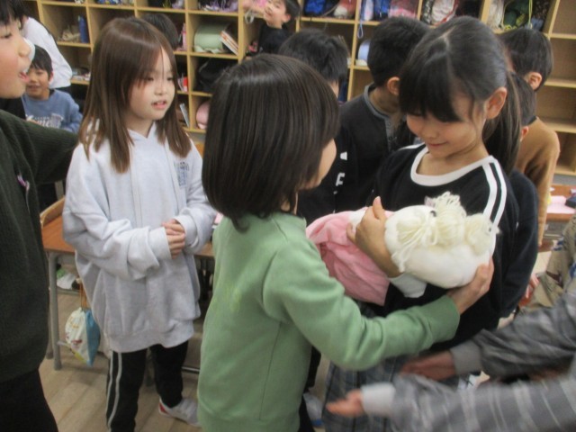 生活科「わたしたんけん」では、生まれたころの学習を始めています。身長や体重は、だいたい50cm、3000gの赤ちゃんが多いことが分かりました。抱っこするとどのくらい?とその恰好をしてみても、今ひとつピンとこない子供たち。では、、、ということで赤ちゃん人形の登場です。次々に抱っこし、「意外に重い」「首がぐらんぐらん」、優しく首に手を当てて支えたり、思い出のおもちゃであやしてみたりと、自分の幼いころの様子を思い浮かべながら、すっかりパパ・ママの気分になっていました。