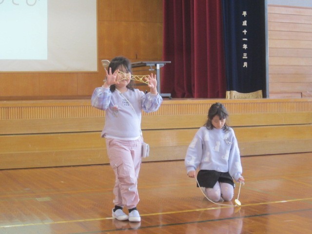 集会委員会主催の「得意なこと発表会」に、多くの1年生が参加しました。縄跳びや昔の遊び、マット運動など、全校の前で堂々と披露していました。見ている子供も「○○さん頑張れー!」と、応援し、温かい雰囲気が流れていました。