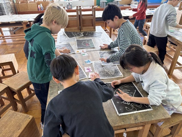 今週の図画工作では、はんがに色を付けました。コンテパステルを削って、色を混ぜたり、塗り方を変えてみたりする子供たち。すてきなはんがになるように、工夫していました。