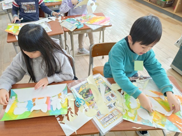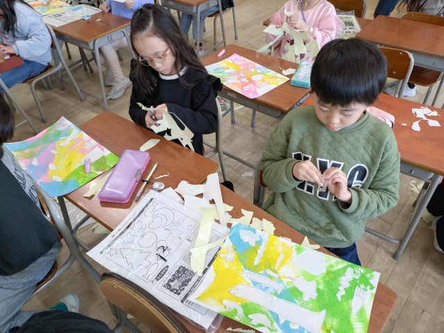 先週、ローラーで色を付けた台紙に、作ったシールを貼りました。表したい世界をイメージしながら、シールの形や貼る位置を工夫しました。