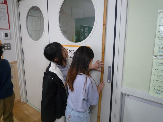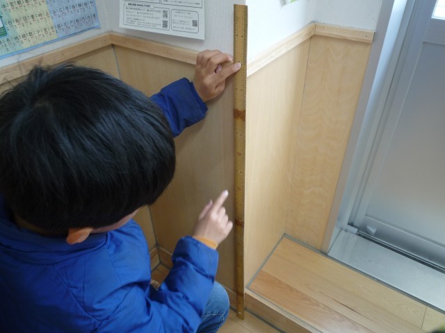 今日の算数では、1mものさしを使って、身の回りのものの長さを測りました。これまでの学習で、長い長さを表す「メートル」という新しい単位を学び、表せる長さの幅を広げた子供たち。まずは、測るものや場所の長さを予想してから、実際に測ることで、正しい長さの感覚を身に付けました。