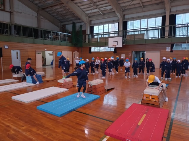 今日から跳び箱の学習が始まりました。踏み切りや手の付き方に気を付けて練習しています。
