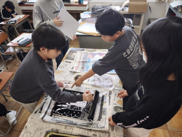 図画工作科の学習で、彫刻刀を使い、「動く生き物を表そう」というテーマで版画制作をしています。今日は、彫り上げた子供たちから、版画インクで刷りました。この後、裏から絵の具で着色して完成です。一人一人が、下絵から根気強く作品づくりに取り組んできました。仕上がりが楽しみです。