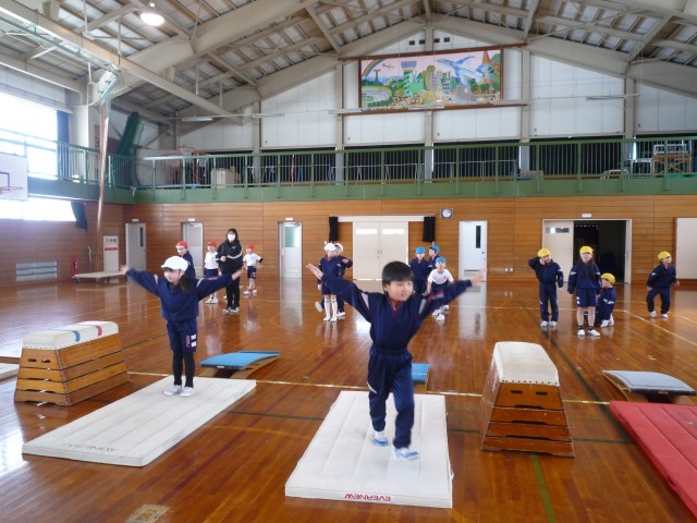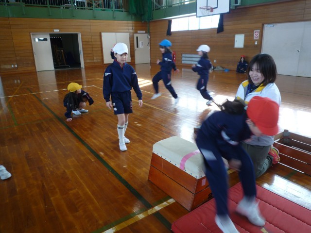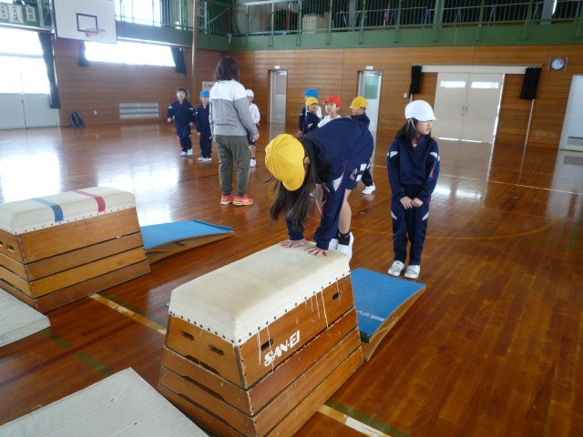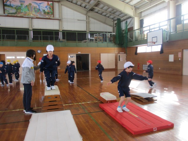 スポーツ支援員派遣事業として、2年生は「とびばこ」の指導を受けました。両足で踏み込む練習や、両足で着地をしてぴたっと止まる練習、お尻を高く上げて跳ぶ練習などを繰り返し行いました。指導員の方のアドバイスを聞いたり、繰り返し練習したりするうちに、みるみる上達する子供たちの様子を見ていると、とてもうれしかったです。終わったあとも、「4段が跳べた!」や「しっかり着地できた!」と喜んでいました。自分たちの頑張りで、また一歩、成長できました。