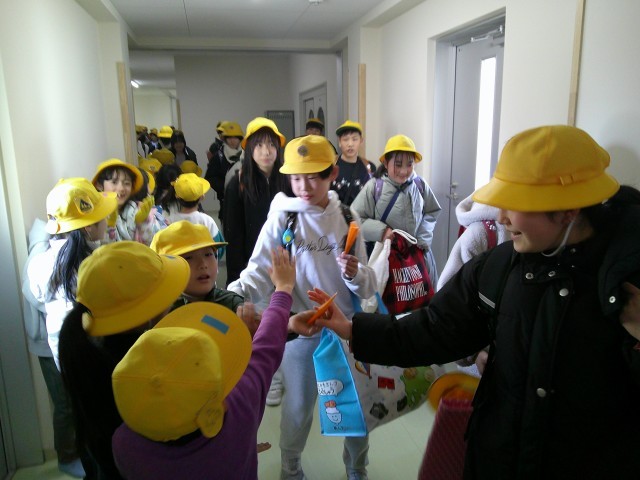 明日は大好きな6年生の卒業式です。6年生は在校生に見送られながら、お別れをしました。1年生は、特に縦割り班の6年生には思い入れがあり、給食の後、折り紙で手紙を作って見送りの時に渡しました。