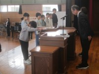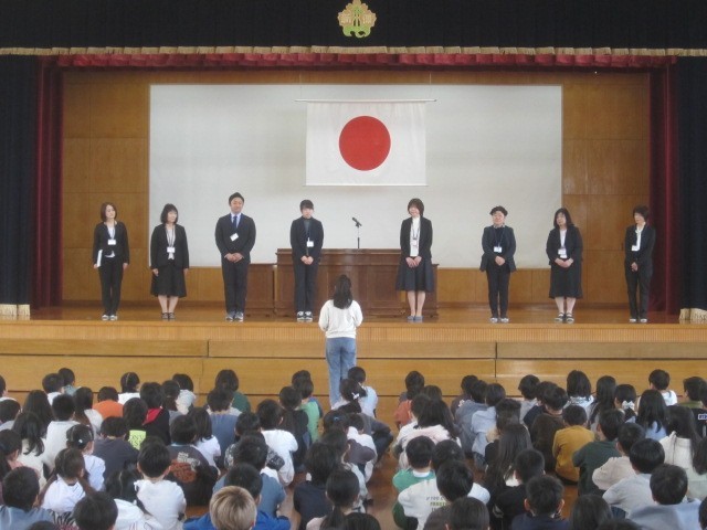 今年度の異動で転出することになった教員の離任式を行いました。代表児童が、「新保ならではの行事を忘れないでください」とお別れの言葉を述べ、みんなで感謝の気持ちを込めて校歌を歌いました。その後、子供たちは、大好きだった先生たちとの別れを惜しみました。