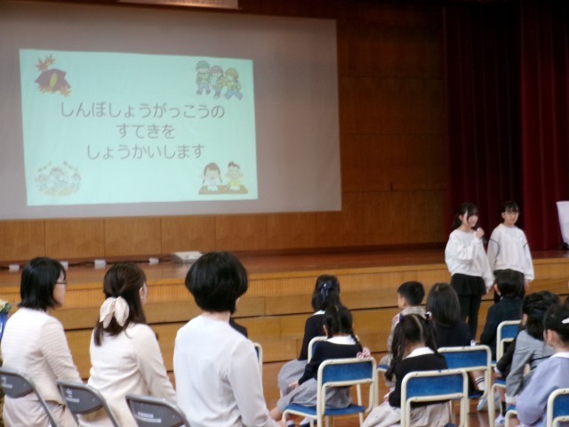 式の後の歓迎会では、6年生の代表児童が新保小学校の素敵を紹介した後、5・6年生で「はじめの一歩」を歌い、歓迎の気持ちを届けました。
