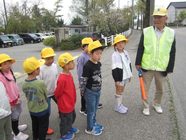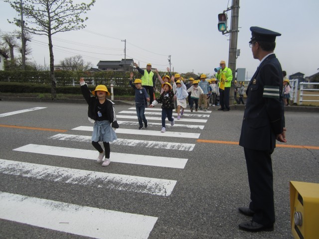 また、体育館でお話を聞いたあとは、実際に道を歩き、横断歩道は、右左右を見て、手を挙げて渡るということを確かめました。