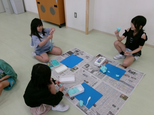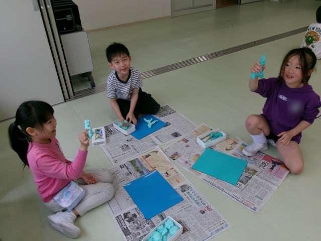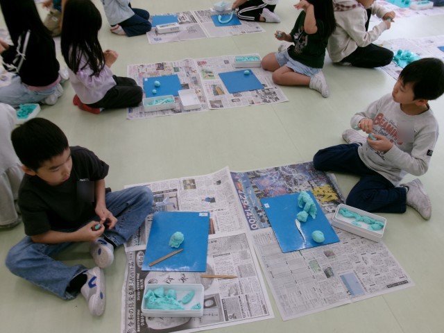 今日は学年で図工をしました。にぎったねん土がどんな形に見えるか考え、色々なものを作りました。恐竜やぎょうざなど、面白い作品がたくさん完成しました。