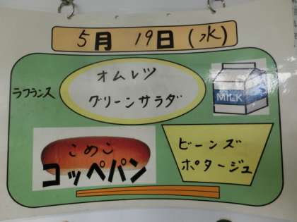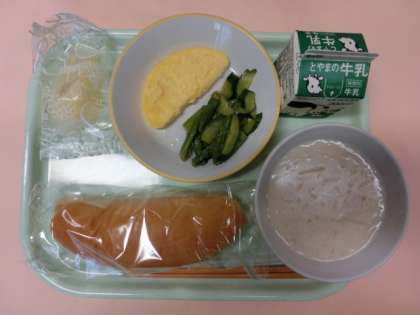 今日の献立は、米粉コッペパン、牛乳、オムレツ、グリーンサラダ、ビーンズポタージュ、冷凍ラフランスでした。