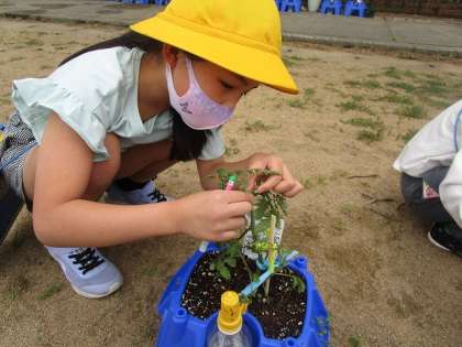 今日は、育てている野菜の困りごとを学級で相談して、実際にお世話しました。風対策ために添え木や支柱を立てたり、わき芽を摘んだりしました。雨の日が続いていますが、お世話を欠かさず、愛情いっぱい育てていきます。