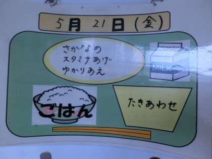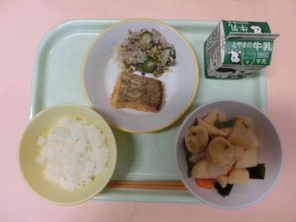 今日の献立は、ごはん、牛乳、魚のスタミナ揚げ、ゆかり和え、炊き合わせでした。