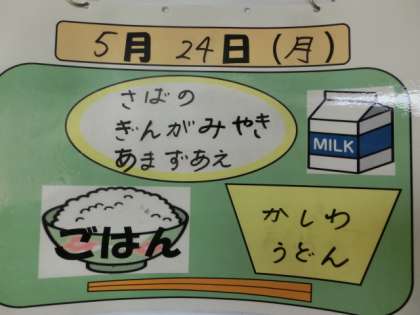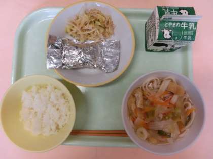 今日の献立は、ごはん、牛乳、サバの銀紙焼き、甘酢和え、かしわうどんでした。