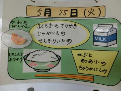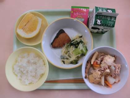 今日の献立は、ごはん、牛乳、ふくらぎの照り焼き、じゃがいもの千切り炒め、かぶと厚揚げの中華煮込み、かわちばんかん、シソ昆布ふりかけでした。