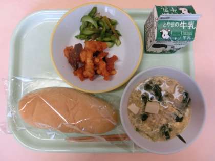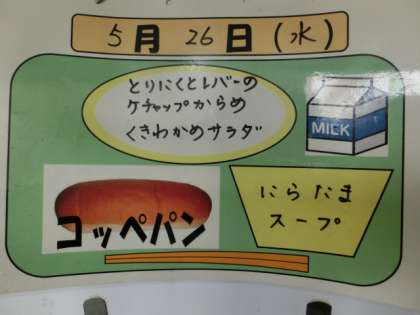 今日の献立は、コッペパン、鶏肉とレバーのケチャップからめ、茎わかめサラダ、ニラ玉スープでした。