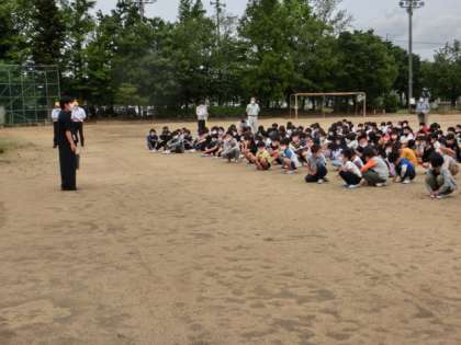 今日は、給食室から出火した想定の避難訓練を行いました。全校が避難する形の訓練は、今年度初めてです。中央階段を使い、南玄関からグラウンドに避難しました。