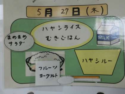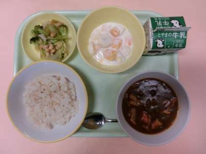 今日の献立は、麦ごはん、牛乳、ハヤシライス、まめまめサラダ、フルーツヨーグルトでした。