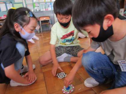 国語科では、さまざまなこまの特徴や楽しみ方を比べながら学習を行ってきました。最後に、いろんなこまを実際に使ってみて、違いを実感していました。