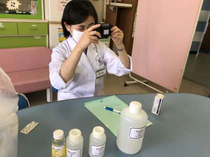 学校薬剤師の先生に水質検査を行っていただきました。安全のために、毎日の水質検査に加え、定期的な専門機関の衛生検査を受けています。