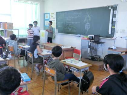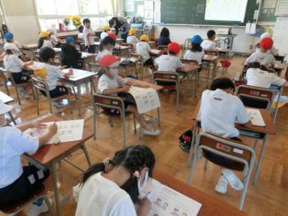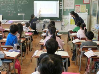 授業では、集中してワークに文字を書いたり、先生の説明を聞いたりしています。6年生では、自分の考えをみんなの前で説明しています。