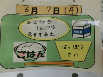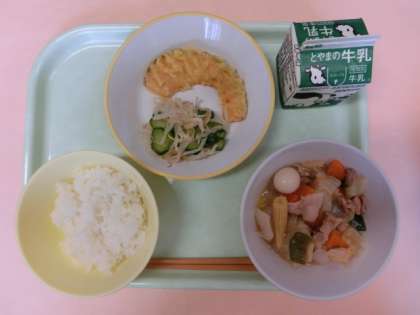 今日の献立は、ごはん、牛乳、かぼちゃの天ぷら、甘酢和え、八宝菜でした。