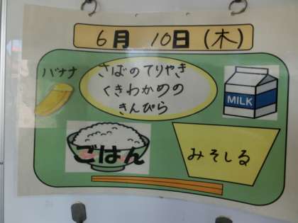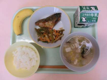 今日の献立は、ごはん、牛乳、サバの照焼、茎わかめのきんぴら、みそ汁、バナナでした。