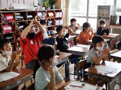 すこやか保健の時間には、各クラスで、保健委員会作成の「菌滅の歯みがき〜クイズ編〜」に答えたり、全国小学生歯みがき大会の動画資料を見たりして、「歯みがきの3つ基本」や「エチケット歯みがき」について知る時間をもちました。