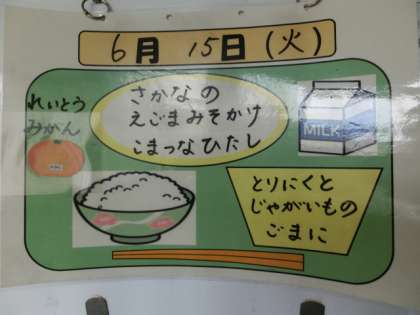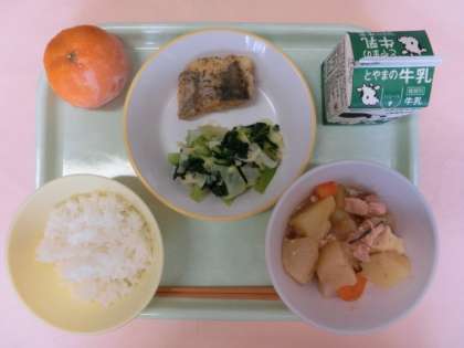 今日の献立は、ごはん、牛乳、魚のえごまみそかけ、小松菜ひたし、鶏肉とじゃがいものゴマ煮、冷凍みかんでした。