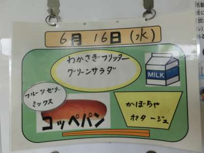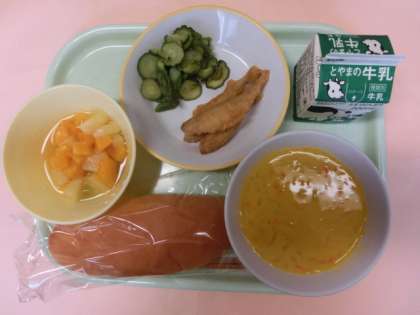今日の献立は、コッペパン、牛乳、わかさぎフリッター、グリーンサラダ、カボチャポタージュ、フルーツゼリーミックスでした。