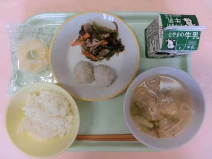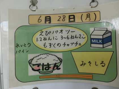 今日の献立は、ごはん、牛乳、えびパオツー、もずくのチャプチェ、みそ汁、冷凍パインでした。