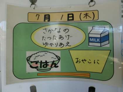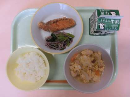 今日の献立は、ごはん、魚の竜田揚げ、ゆかり和え、親子煮でした。